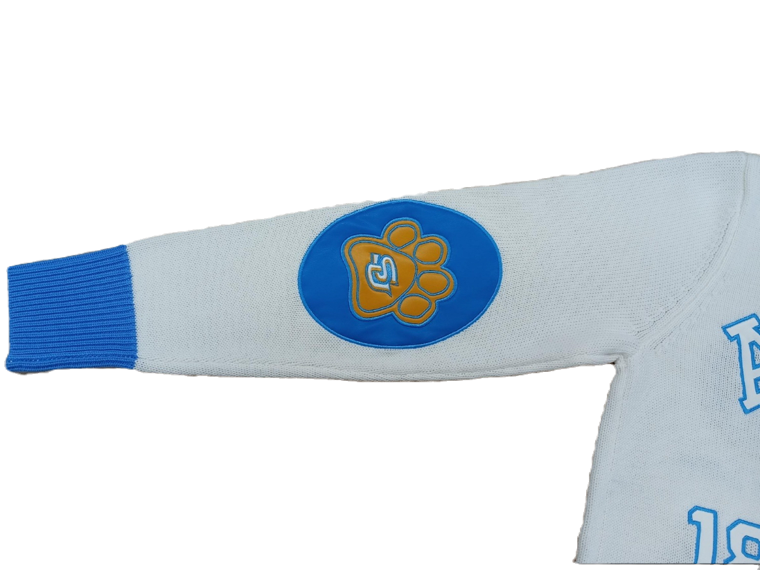 Custom V neck classic Southern University Alumni EDUCATOR Sweater. Soft and comfortable knitting with customized embroidery. Show your school pride in style and be set apart from the crowd. Leather SU Jaguar Paw patch on elbows.
